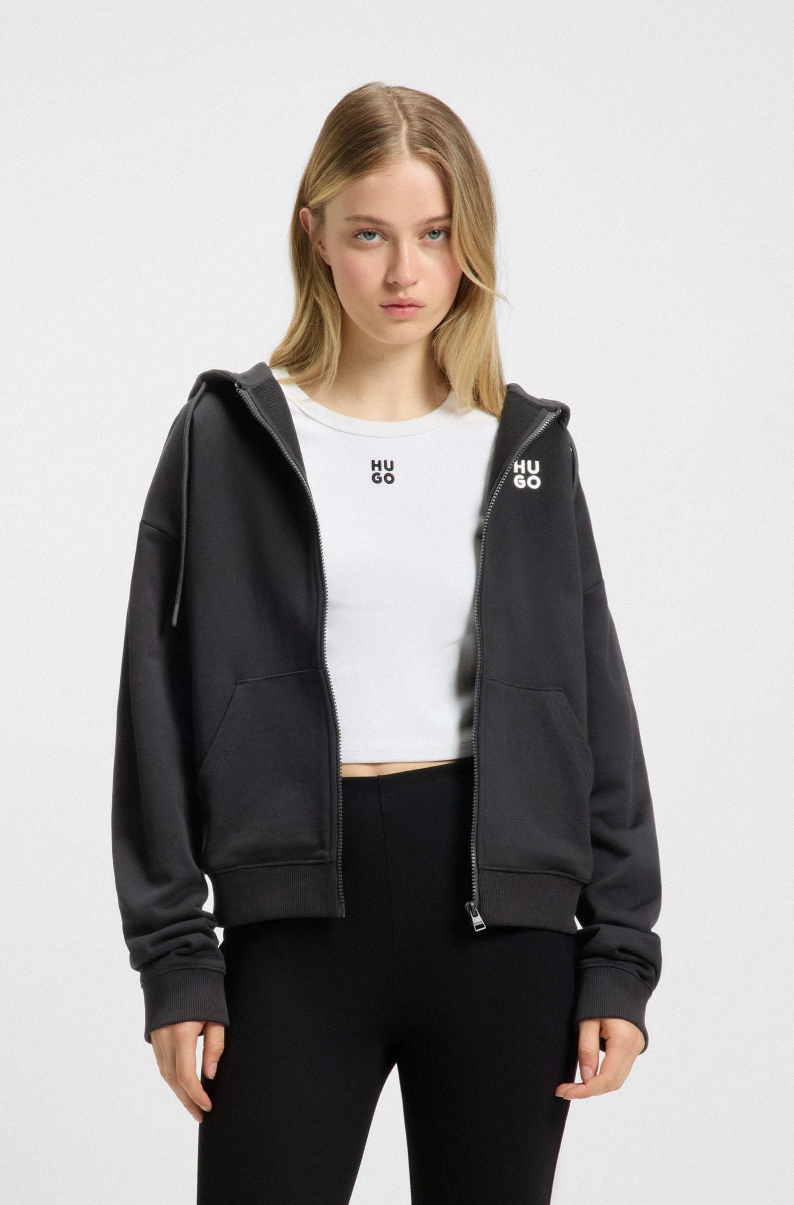 Zippez ce sweat à capuche HUGO Womenswear sur n'importe quel look pour un confort décontracté. Coupe droite. Épousse en coton doux. Logo empilé brodé.