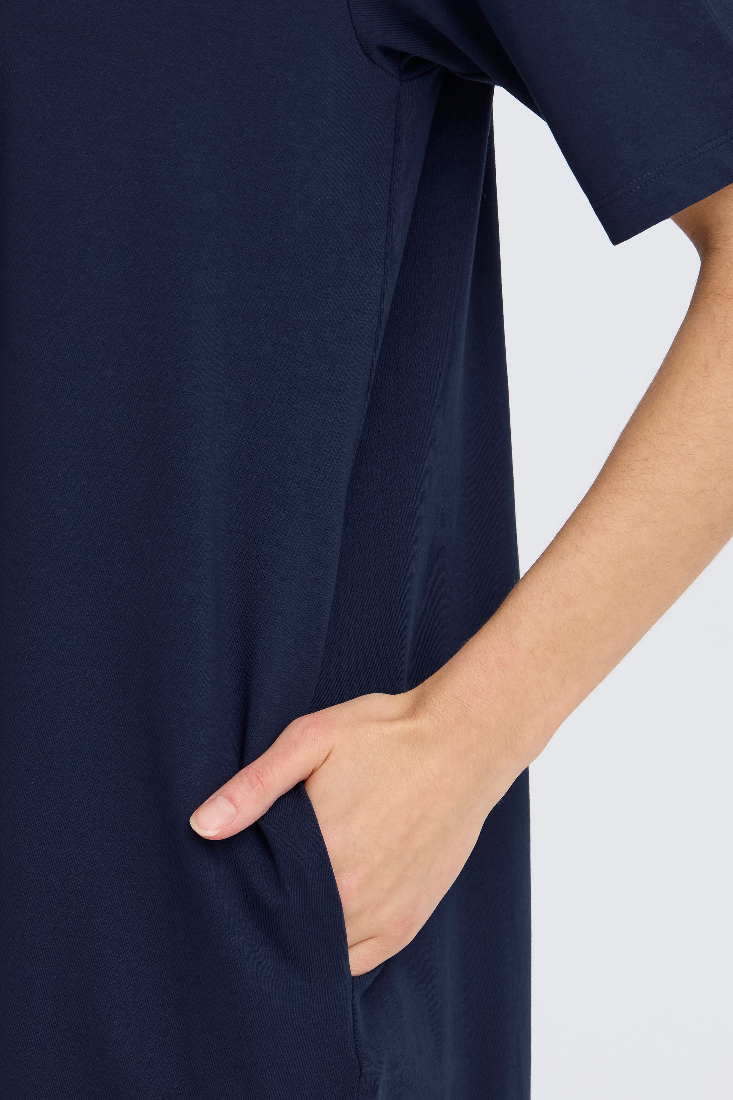 Robe t-shirt coupée dans une silhouette droite avec une finition douce et lisse. Comprend un col ras du cou classique, des manches courtes et des finitions au-dessus du genou pour un look décontracté mais poli.